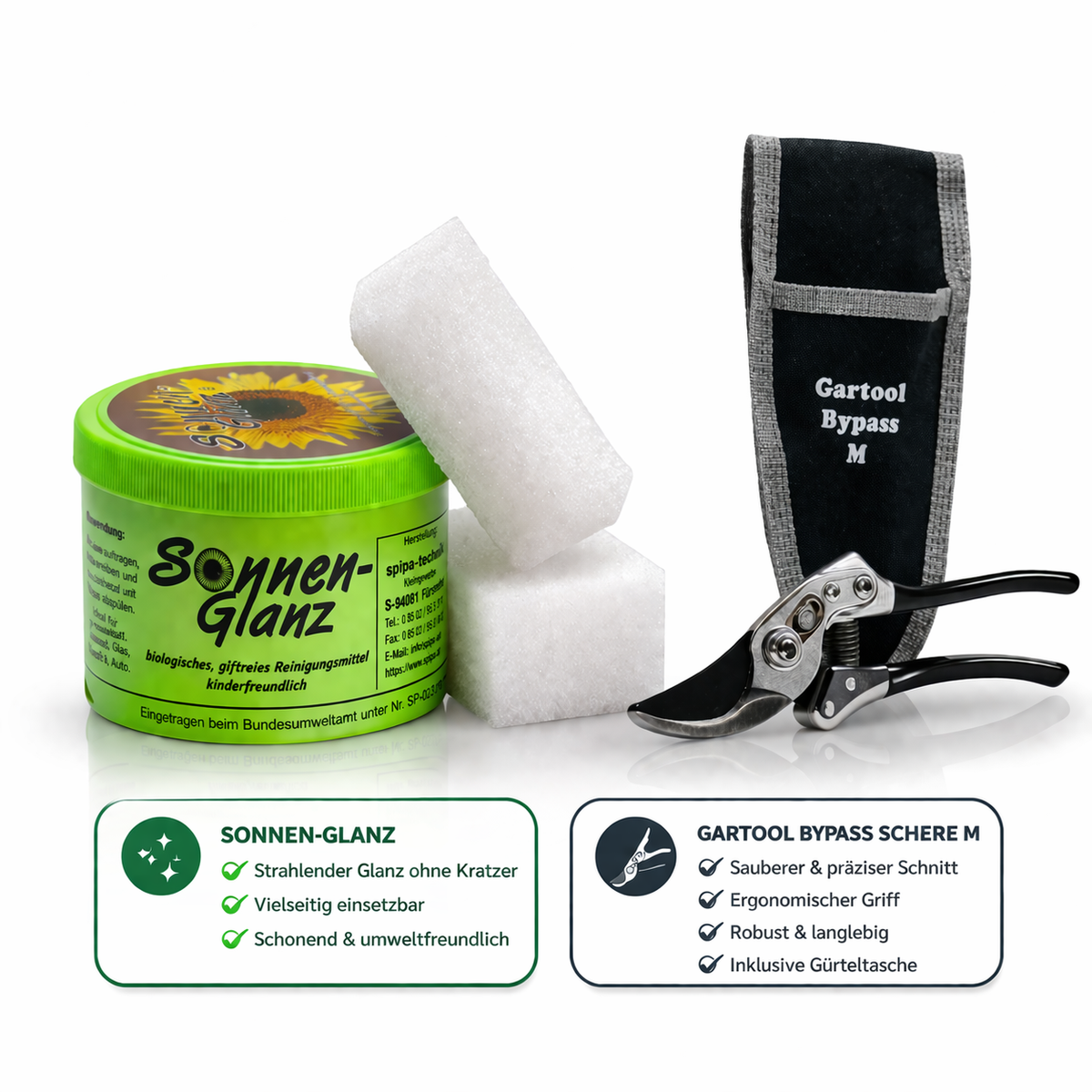 Sichern Sie sich jetzt unseren beliebten Spipa® Sonnenglanz (300 ml) – ideal für den perfekten Frühlingsputz in Haushalt, Auto, Wohnmobil oder Boot – inklusive Bypass Schere M für einen präzisen und mühelosen Schnitt in Ihrem Garten.